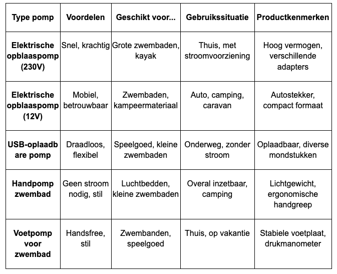 Kies de juiste pomp aan de hand van jouw specifieke wensen en gebruikssituatie. Deze tabel helpt je bij het maken van de beste keuze: