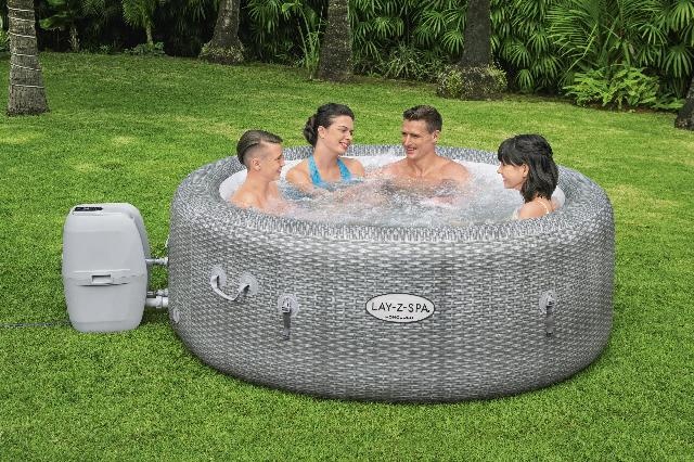 Opblaasbare ronde spa voor 4-6 personen. Grijze rotanlook buitenkant van DuraPlus materiaal en een liner met mozaïek print op de zachte, isolerende bodem. De pomp heeft een nieuw flip up controlepaneel met moderne touchscreen en daarachter een klein plateau voor drankjes (beker, blikje of glas). De pomp beschikt ook over het bekende Power Saving System (automatische start/stop timer)