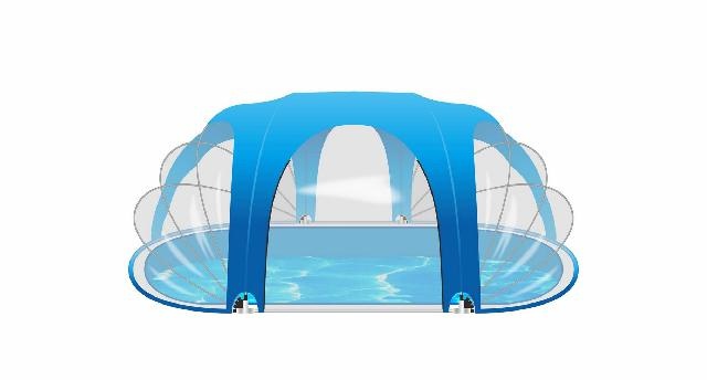 Zwembadoverkapping van 0,20/0,25 mm pvc met buizen van fiberglas. Hiermee wordt vervuiling door bladeren e.d. voorkomen en ook blijft het water beter op temperatuur. Daarnaast werkt het als UV-bescherming (factor 50+).